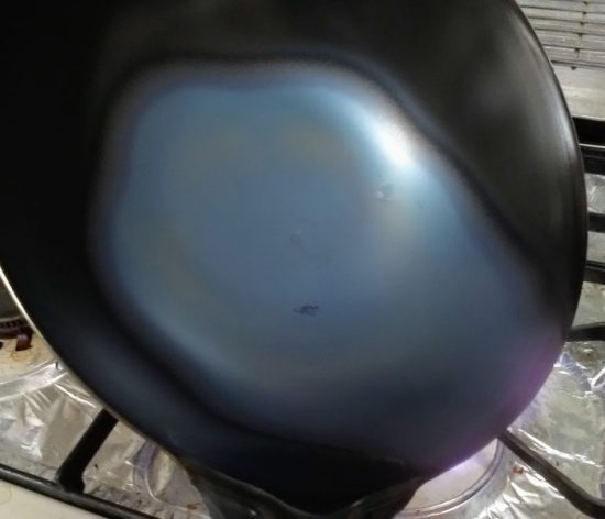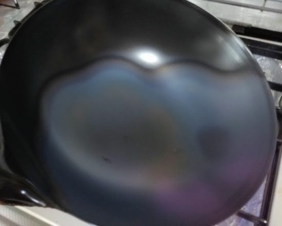 ちなみに、せっかく空焼きが終わって、中華鍋が青白く輝いているのに、中華鍋に油を引いた状態であまりにも高温に熱すると、油が焦げて、調理面が茶色になってしまうかもしれません。