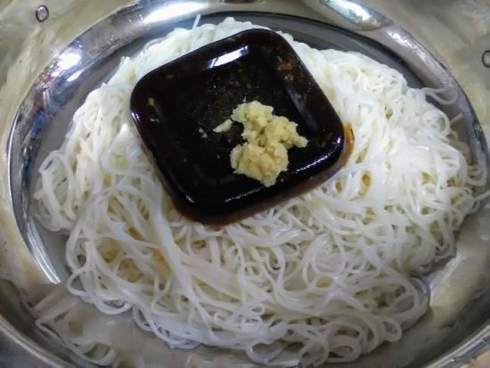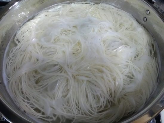 鍋の中の素麺が魚の煮汁を十分に吸い込んで、煮えたら、お皿に盛ります。
